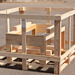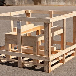 Diese Einwegpalette ist mit einem Verschlag ohne Deckel sowie einem herausnehmbaren Einsatz kombiniert. Damit eignet sie sich beispielsweise für den Versand von Trommeln: Dazu wird der Einsatz zum Einsetzen der ersten Trommel herausgenommen und anschließend für die zweite Trommel wieder eingesetzt und fertig verpackt.
