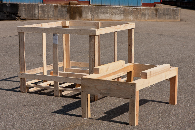 Auch für diese individuelle Maßanfertigung sind alle Holzverbindungen mit durchgehenden Schloss-Schrauben oder Gewindestangen ausgeführt, teilweise auch mit Schlüsselschrauben. Alle Schraubenenden sind mit großen Holzbauschrauben versehen, damit die jeweiligen Verbindungen fest angezogen werden können.
