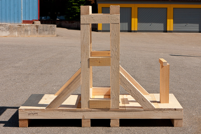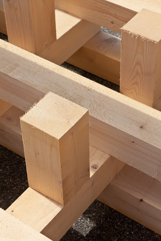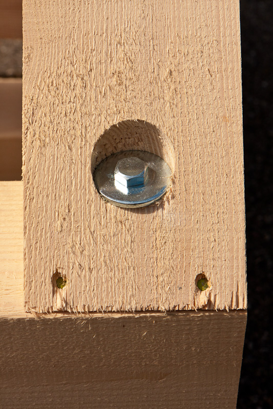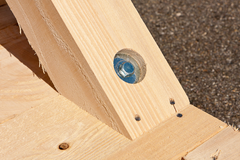 Alle Holzverbindungen sind mit durchgehenden Schloss-Schrauben oder Gewindestangen, teilweise auch mit Schlüsselschrauben ausgeführt. Alle Schraubenenden sind mit großen Holzbauschrauben versehen, damit die jeweiligen Verbindungen fest angezogen werden können.
